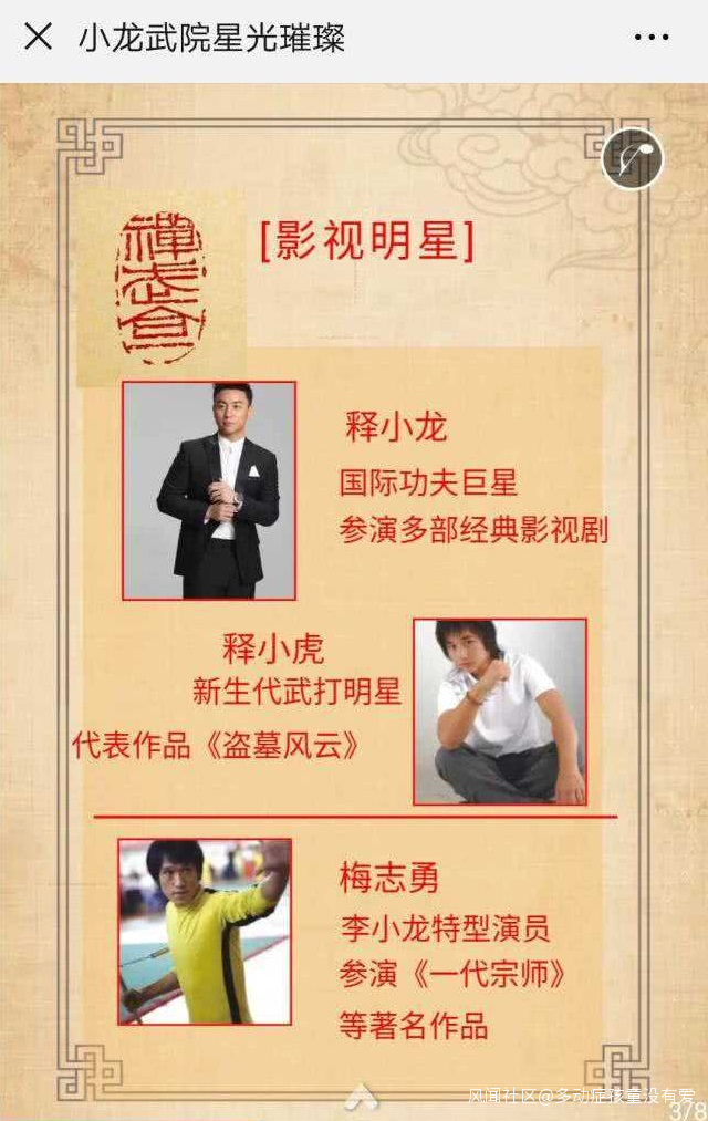 官網首頁滾動有橫幅的釋小龍代言圖片,校內多處都可見到演員釋小龍的照片。此外,據該學校官方微信表示,與其有關的明星,還包括參演《盜墓風雲》的釋小虎,以及李小龍特型演員梅志勇等。