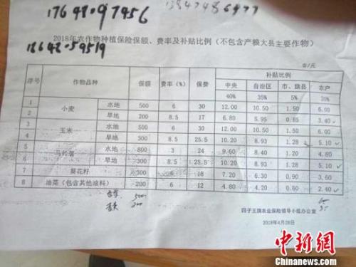 內蒙古四子王旗萬億糧農業種植專業合作社的農民孫彩兵介紹,2018年合作社在中華聯合財產保險公司四子王旗支公司購買了農作物種植保險。按照中央相關規定,保費各級政府共補貼80%:“中央自治區等政府補貼的,農户交就是20%。”