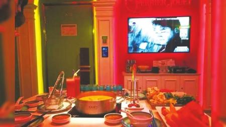 位於成都青羊區的一家KTV,旗幟鮮明地打起了“火鍋KTV”的招牌。“8葷5素,線上直接下單,火鍋直接送進包廂。”工作人員正在向顧客介紹。