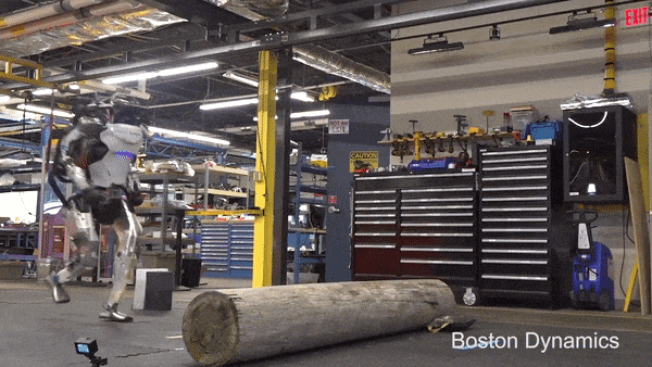五個月之後,Atlas的運動能力巨幅提升,秀了一波跑酷。一步步小跑,順勢跳過了地上的圓木。