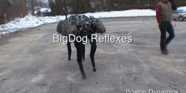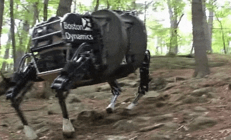 大狗2005年首次亮相,是為了給士兵運輸貨物而設計的,它可以踉踉蹌蹌的在不同地形上行走,馱154公斤重物,還能爬上35度斜坡。
