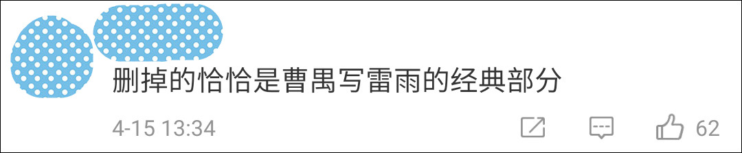 對此,有網友表示,“被刪掉的恰恰是《雷雨》中最經典的部分”,“這還能叫體現了作者的原意?”
