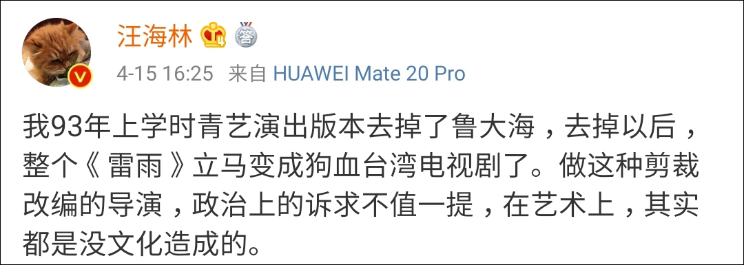 對於青春版《雷雨》將魯大海去掉這件事,知名編劇汪海林在微博表示,他1993年上學的時候青藝演出的版本就去掉了魯大海。