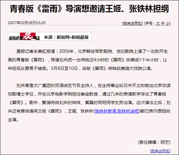 另據新聞晨報與齊齊哈爾網報道,這部話劇的導演劉兵曾是文廣集團的雙語綜藝節目主持人,曾主持過中央電視台、上海東方電視台等多個大型中、英雙語晚會及頒獎典禮。劉兵還是上海戲劇學院表演系碩士,北京電影學院、上海師大、東華大學客座教授。新聞晨報提到,這部青春版《雷雨》是劉兵根據幾年表演教學經驗創作的。