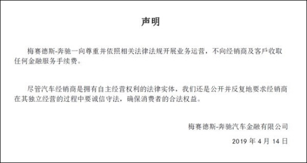 稍晚時分,就車主被迫交納金融服務費1.5萬一事,梅賽德斯-奔馳發表聲明稱:一向尊重並依照相關法律法規開展業務運營,不向經銷商及客户收取任何金融服務手續費。梅賽德斯-奔馳公開並反覆要求經銷商要誠信守法,確保消費者的合法權益。