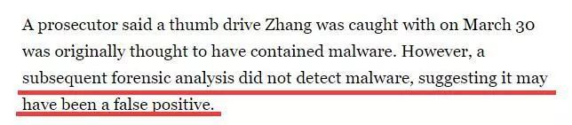 不過,在北京時間今天凌晨1點開始的庭審上,此前曾宣稱張玉婧的U盤裏有病毒的美國檢方突然改口,稱後續的檢驗發現張玉婧的U盤裏其實沒有惡意軟件,起初特工認為她攜帶惡意軟件可能是誤報。
