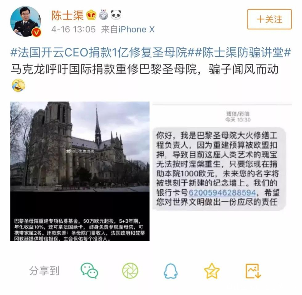 公安部刑偵局副局長陳士渠也在微博上稱:馬克龍呼籲國際捐款重修巴黎聖母院,騙子聞風而動。