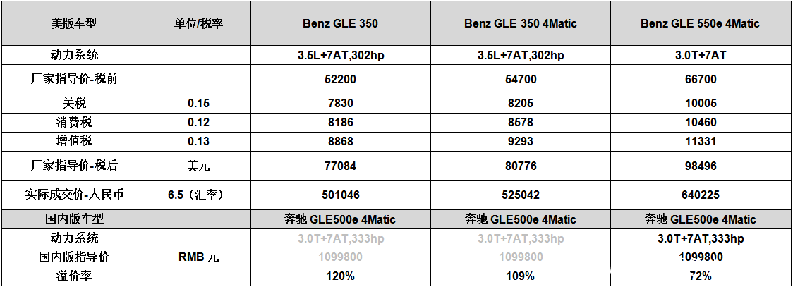GLE中美主要車型和價格見下表(表中灰色字體為對標車型價格):