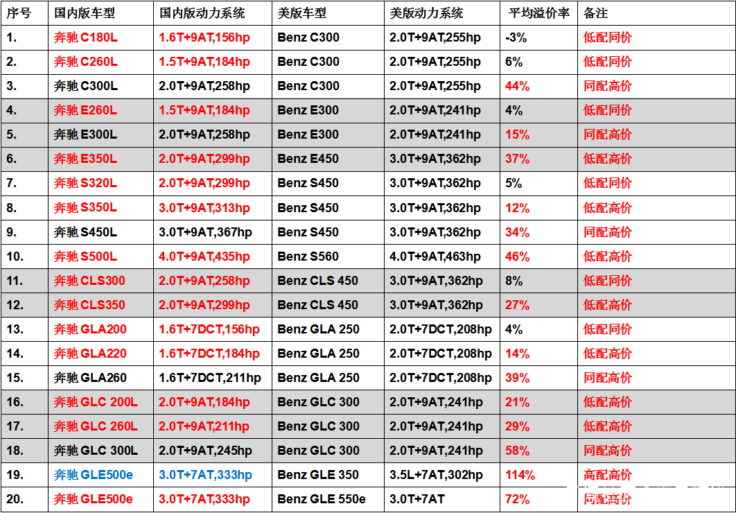 2. 動力系統低於美版的車型,有些價格高於美版。比如國內版E350L比美版E450貴37%,國內版CLS350比美版CLS450貴27%,國內版GLA220比美版GLA250貴14%,國內版GLC200L比美版GLC300貴21%,國內版GLC260L比美版GLC300貴29%。這種車型完全就是“歧視性配置”和“歧視性定價”的集合體,奔馳實在犧牲中國消費者利益的前提下賺取自己的利潤。