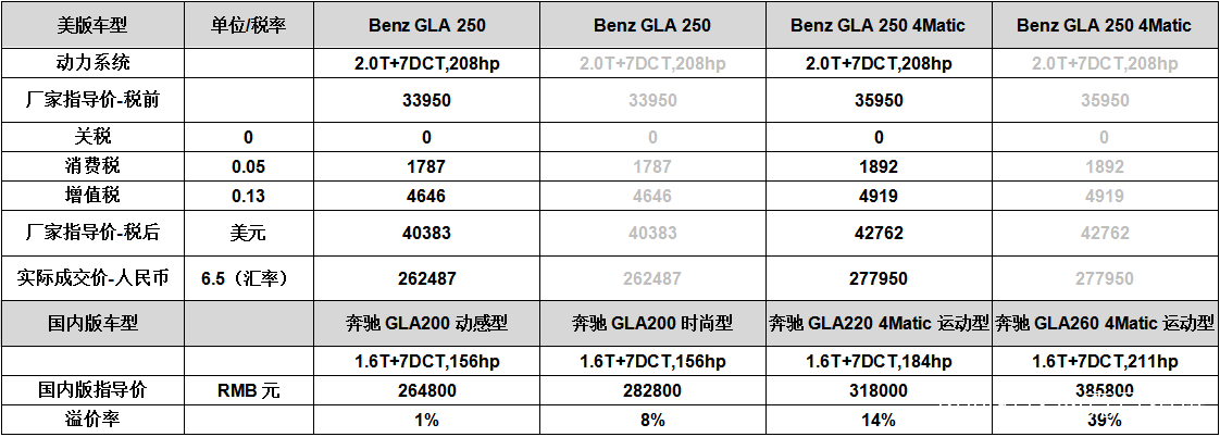 GLA中美主要車型和價格見下表(表中灰色字體為對標車型價格):