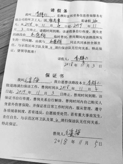 記者在富邦勞務公司,見到了一份請假條,主要內容為李羣山因家中有事,從2018年11月4日到2019年11月3日,請假360天,其間由毛喜梅替崗,發生一切問題與示範區環衞隊無關。