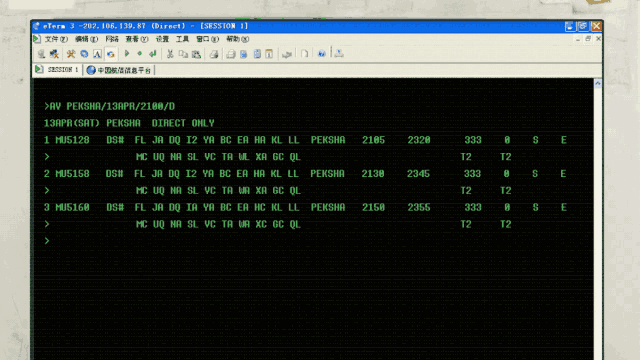 這個 AV 全稱是 Availability ,表示航班的庫存座位,是黑屏系統中最常用的指令。PEK 是北京SHA 是上海,後面是時間和經停標識。