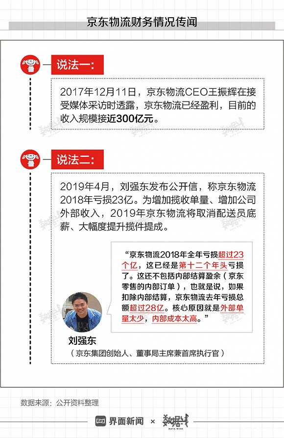 界面數據(公眾號ID:shujuxian_kuaikan)梳理公開資料發現,京東方面關於京東物流盈虧情況的説法,存在互相矛盾的地方。