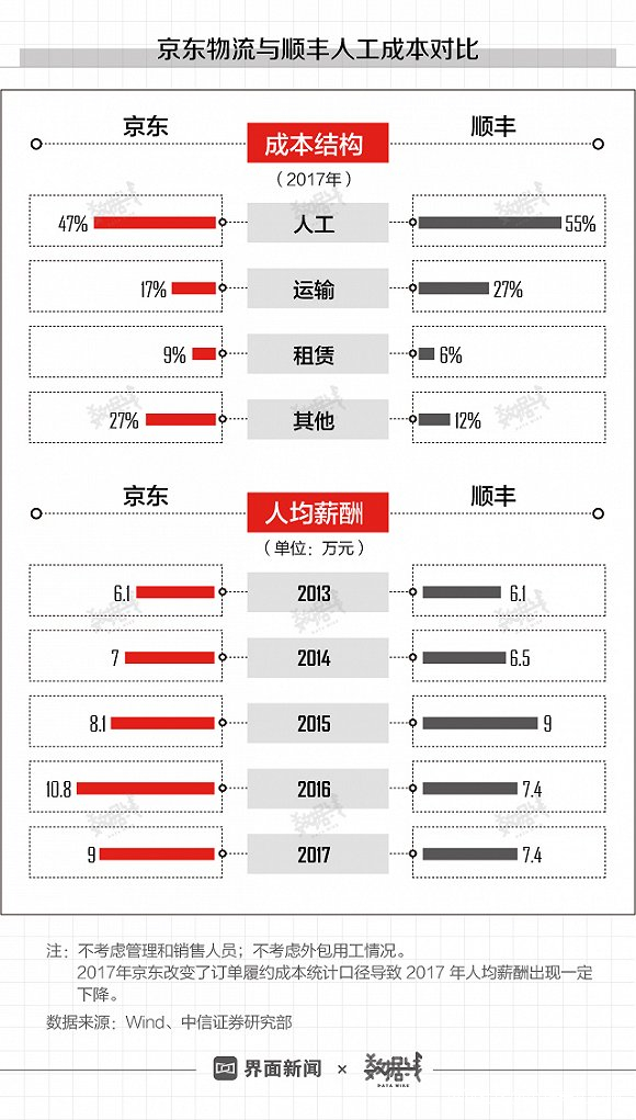 京東物流的人工成本佔比沒有順豐高,但人均薪酬超越順豐。2013年,京東物流和順豐的人均薪酬均為6.1萬元,2014年至今始終在順豐之上。