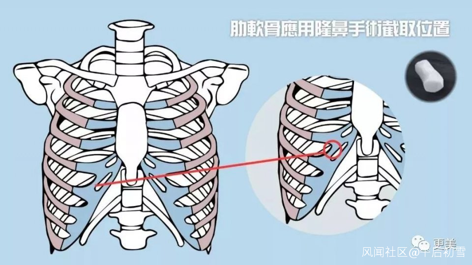 肋軟骨取用:肋軟骨是連接胸骨的部分,隆鼻一般從第6/7/8三根肋軟骨選取,在身上開4cm左右的小口去除。
