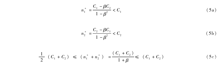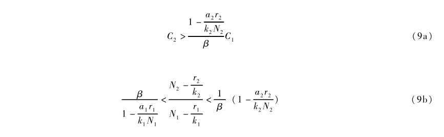 我們可以用類似解方程(2)的方法,來解方程(8)。其技術1完全替代技術2 的條件 由式子(9a)給出,而兩種技術共存的條件如(9b)式所示: