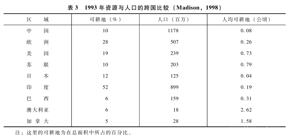 表3顯示出資源—人口比例在亞洲和西方國家之間差異很大。我們可以把西方文明的特徵描寫為節約勞力消耗資源的文化;而亞洲和中國文明的特徵則是節約資源消耗勞力的文化。從技術上説,中國有能力在哥倫布之前發現美洲大陸(Menzies 2002)。李約瑟提問:為什麼科學和資本主義起源於西方而不是中國(Needham 1954)。李約瑟問題的答案可以研究歷史上環境與文化之間的相互作用得到啓示(Chen 1990)。