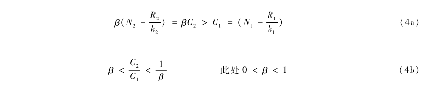 和以前一樣,我們把生態學的變量用括號表示,放在經濟學變量之後。這裏,n1和n2是技術或產品(物種)1和技術(物種)2的的產出(人口)。N1和N2是他們的資源限制或市場規模限制(承載力);k1和k2是他們的學習(人口增長)率;R1和R2是他們的退出(死亡)率;β是市場份額競爭的競爭(重疊)係數(0≦β≦1)。