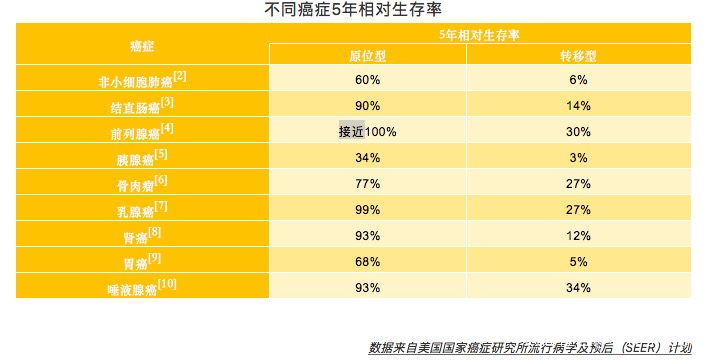 基於當前癌症的臨牀研究數據,早期癌症(多為原位癌)患者的五年相對生存率通常比中晚期(多為轉移癌)的患者高很多,例如:原位型非小細胞肺癌患者的五年相對生存率(60%)比轉移型患者(6%)高十倍(如下表所示)。