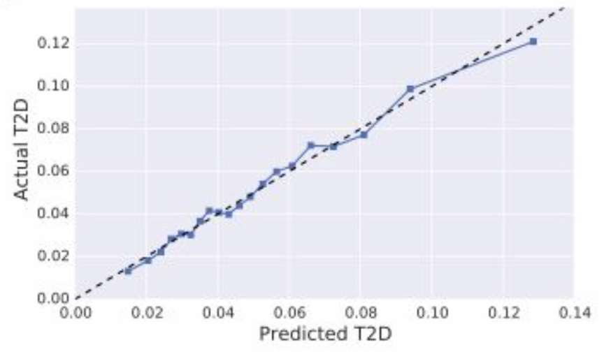 全球領先的基因檢測公司23andMe於今年3月宣佈將為二型糖尿病(T2D)提供遺傳風險評估報告,在其產品白皮書中展示了遺傳風險分數的多個參數表現,包括遺傳風險分數在人羣中的分佈、AUC、基於遺傳風險分數的預測患病比例與實際患病比例校準曲線(下圖)。
