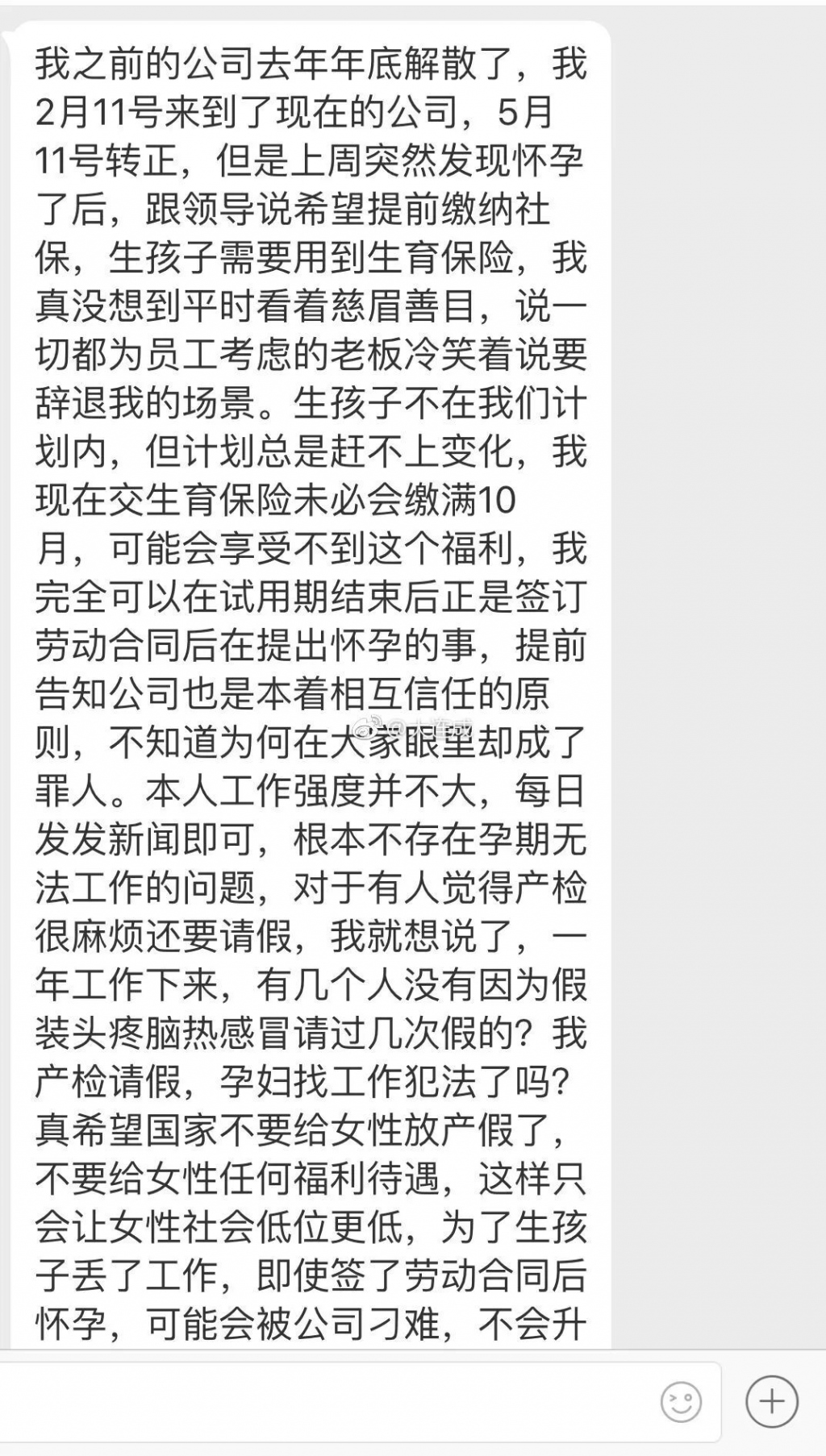 試用期內,女員工發現自己懷孕了。她把情況主動告知公司領導,卻等來了被辭退的結果!4 月 16 日,28 歲的王女士通過微博 “@大連成 “,講述了自己在職場上的遭遇,事情引發網友關注。