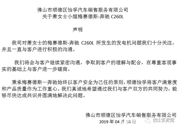 車主蕭女士告訴佛山新聞網(佛山頭條客户端)記者,她於4月4日在順德怡孚奔馳店購買一輛奔馳新車,4月6日發現故障,期間一直斷斷續續出現,期間她與4s店工作人員進行溝通,工作人員表示車輛並無大礙。