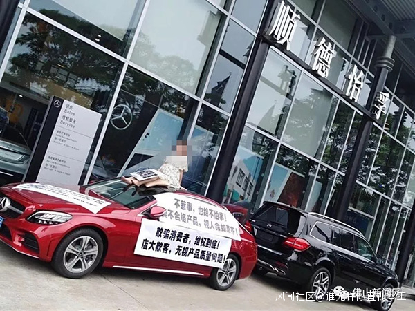 今日下午,網上流傳順德一孕婦坐在奔馳車頂上維權的圖片和視頻。據網友拍攝的視頻顯示,一名身穿碎花連衣裙的孕婦坐在一輛紅色奔馳車頂,手中拿着擴音器和標識牌,向工作人員質問:“我的車才辦了兩日,在高速公路上發動機出現嚴重故障,我隨時和寶寶一屍兩命……”車身上貼有多句標語:“不惹事,也絕不怕事!賣不合格產品,視人命如草芥!”“欺騙消費者,維權到底!店大欺客,無視產品質量問題!”等等。