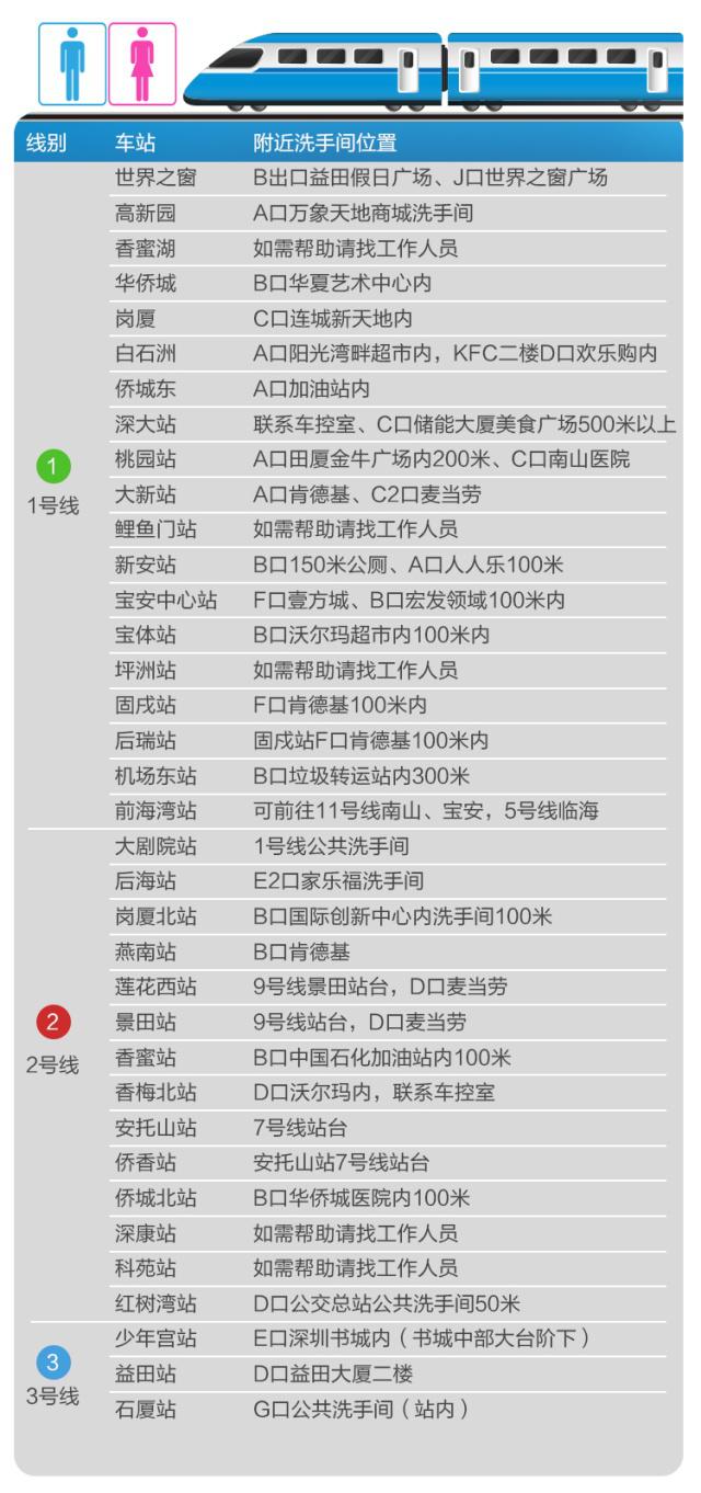 深圳地鐵在2018年9月正式啓動車站衞生間改造項目。將對1、2、3、5號線共82個車站公共區衞生間(1號線23個、2號線23個、3號線12個、5號線24個)進行全面翻新改造,在部分車站增加母嬰室。改造內容涉及天花、牆面、地面、隔板、衞生間潔具、洗手枱、通風、給排水、照明全面翻新,增加衣物掛鈎、紙巾配置等便民措施。