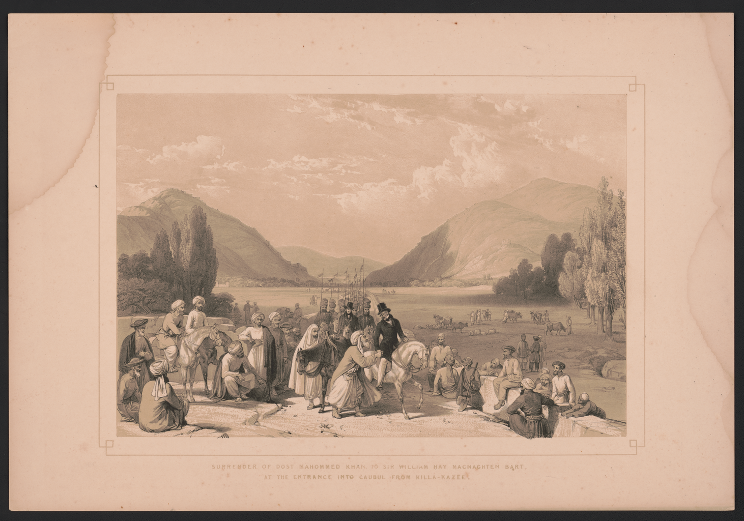 《多斯特·穆罕默德汗在基拉-亞茲的喀布爾入口向威廉·麥克諾滕爵士投降》,1842年,英國,詹姆斯·阿特金森,石版畫,來自1842 年在倫敦出版的《阿富汗素描》。1838 年,阿特金森隨軍前往喀布爾參加第一次英國-阿富汗戰爭(1839-1842 年)。隨着英國的殖民侵略,英語也傳播到世界各地。圖片來源:世界數字圖書館