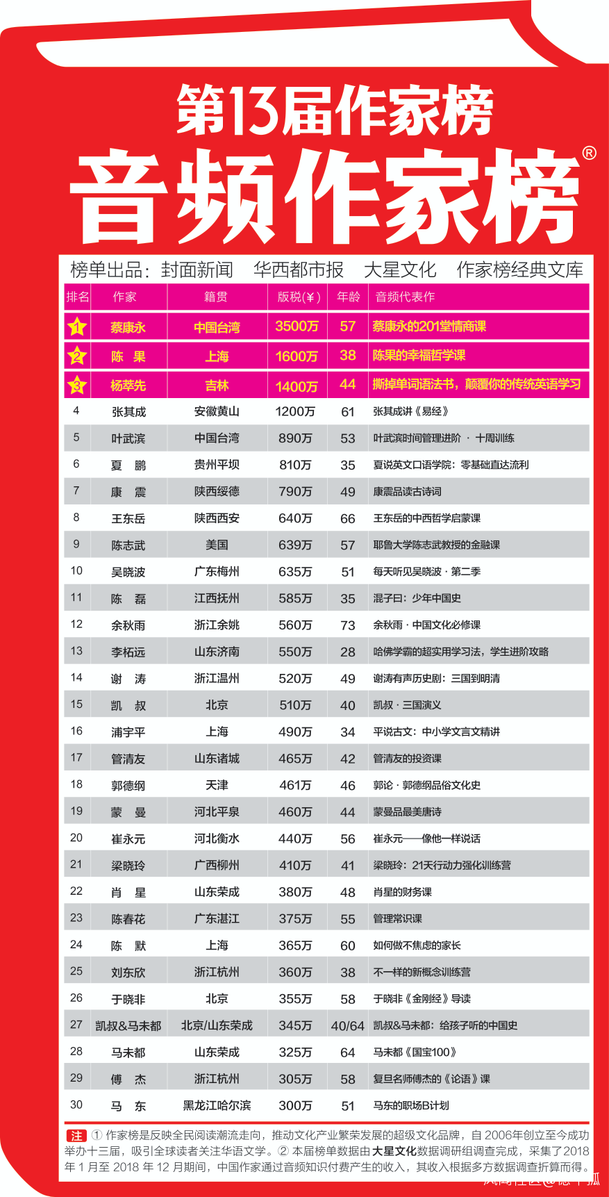 (華西都市報) “音頻作家榜”是從第12屆作家榜才開始設立的全新子榜單,該榜單抓住近年來的流行趨勢,用聲音抓住了讀者的耳朵,首次提出“音頻作家”的概念,對傳統作家的觀念形成極大衝擊。
