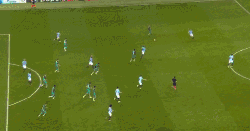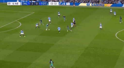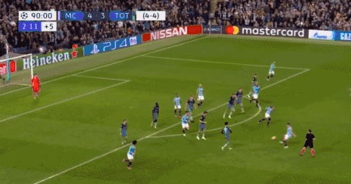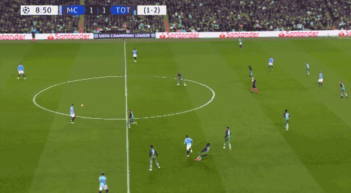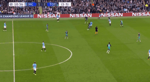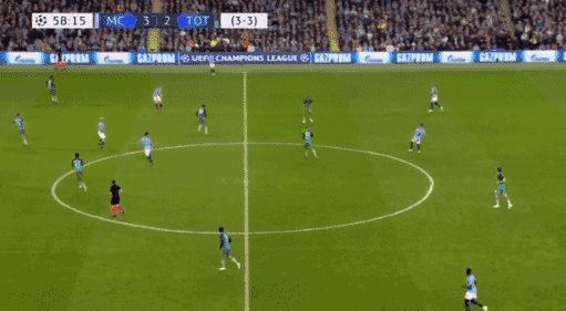 **曼城第11分鐘扳平,阿圭羅斜傳,貝爾納多禁區右側10碼處傳射打在羅斯腿上偏轉入近角,2-2。**這是單場歐冠賽事打入4球的最快紀錄。貝爾納多30碼處任意球直接射門,皮球稍稍高出左上角。**曼城第21分鐘再次超出,德布勞內快發任意球后右路低傳遠點,斯特林小禁區左側小角度左腳推射遠角入網,3-2。**雙方總分3-3暫平,但熱刺仍握有客場進球多優勢。