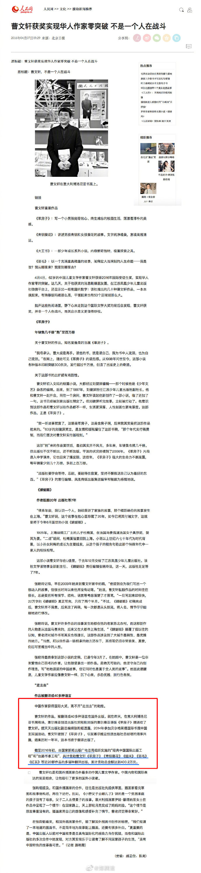 2016年曹文軒在某部門用納税人的錢出資400.2萬元的運作下拿到安徒生獎,400萬元數據來源見2016年4月7日《北京日報》文章《曹文軒,不是一個人在戰鬥》(見圖6)原文鏈接:°曹文軒獲獎實現華人作家零突破 不是一個人在… 本以為曹教授不是一個人在戰鬥拿到有關部門用納税人的400.2萬元運作的安徒生獎後,能獲得自尊,不再去校園違法兜售童書,沒想到會變本加厲,違反《中華人民共和國義務教育法》第二十五條打着講課的幌子進校非法兜售童書愈演愈烈2018年童書銷售所得2700萬元。這其中有多少是進校賣書所得,只有曹文軒自己清楚。