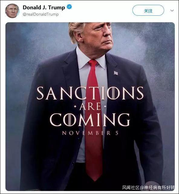 特朗普第一次玩《權力的遊戲》梗是在去年11月,美國政府宣佈重啓對伊朗的制裁,特朗普模仿美劇《權力的遊戲》中“凜冬將至”的橋段,發了一張“制裁將至”的照片。HBO當時回應説:“我們並不知道這件事,但是我們不希望我們的商標被用於政治目的。”