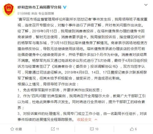 4月19日電 日前,內蒙古晨報記者在採訪時遭到工商局領導懟“你算個啥”。4月19日,呼和浩特市工商行政管理局賽罕區分局在官方微博發佈消息稱,“賽罕區市場監督管理局呼倫所副所長怒懟記者”事件造成惡劣影響,免去楊黎軍副所長職務。