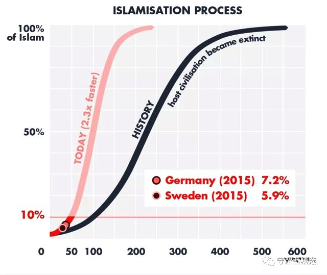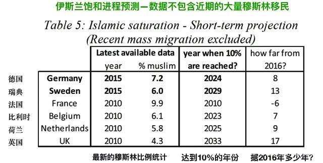 • 今天的許多西方國家非常接近10%的臨界點,甚至已經超過了臨界點。而且今天穆斯林人口達到總人口的10%的速率是歷史上的230%。也就是説德國、瑞典、法國、比利時、荷蘭、英國比當年埃及、突尼斯、伊朗、伊拉克、西班牙、敍利亞、土耳其、阿爾巴尼亞達到10%的速度快2.3倍。
