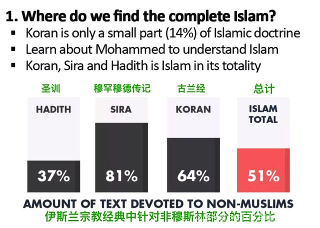 報告指出,與其它宗教不同的是,伊斯蘭宗教經典中有51%的內容是探討如何對待、處置社會中的非穆斯林的。這是一個非常不同尋常的現象,因為通常一個宗教會首要關注信教羣體和其內部事務。