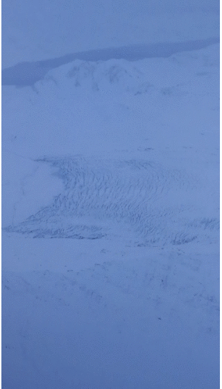 天慢慢亮了,意味着我的工作也結束了。這是北極縱向往下流動的冰川,是我在飛回來的小飛機上拍到的一個畫面。