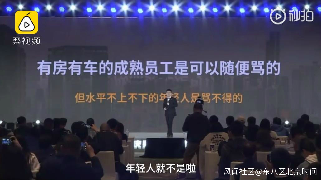 4月19日,在進擊波財經春季峯會上,湃動傳媒CEO沈帥波表示,現在水平不上不下的年輕人罵不得,隨便就寫條10萬+髮網上。而有房有車的成熟員工可以隨便罵,買了房之後他就不敢隨便離職了。