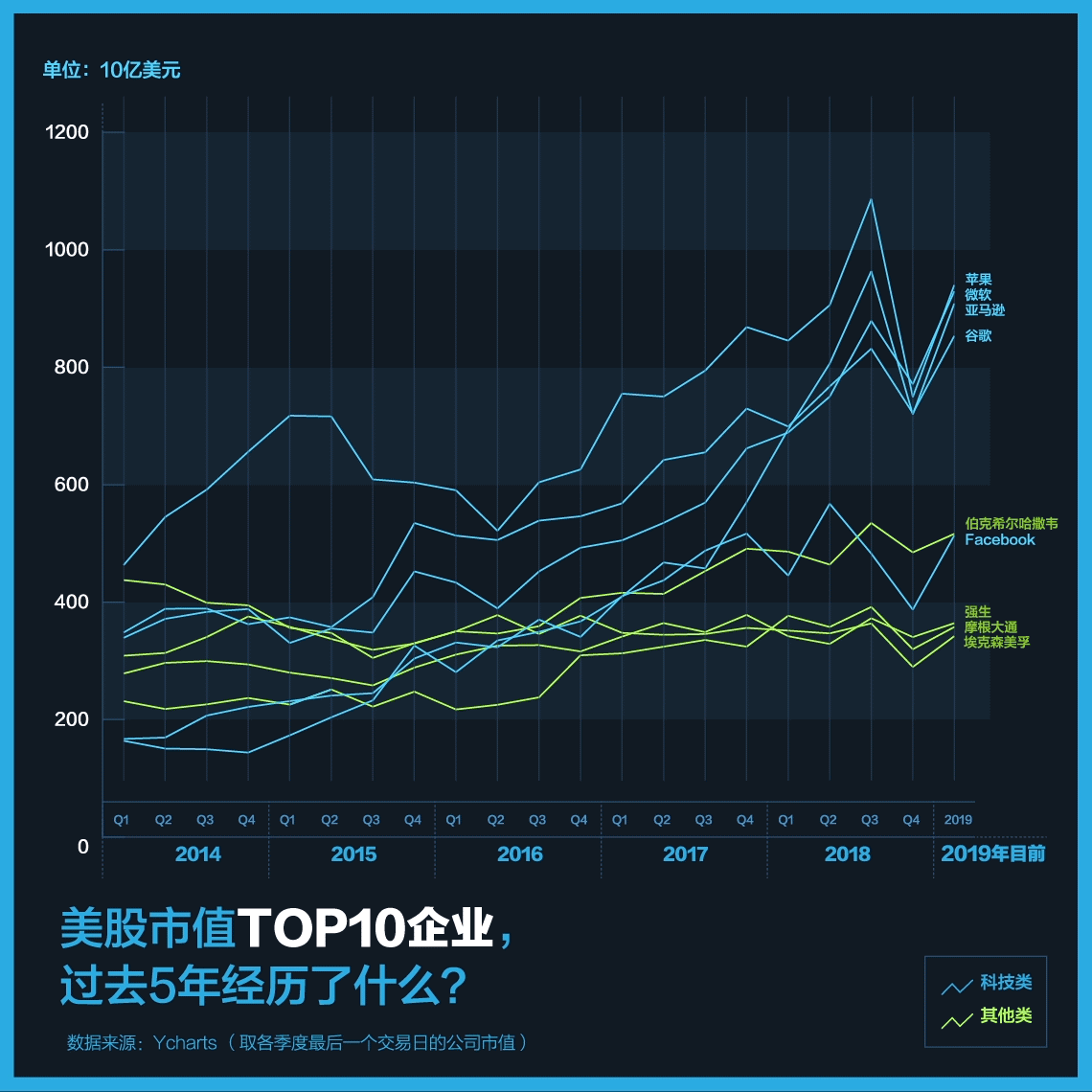 當然,相比於亞馬遜在雲計算、人工智能以及國際化佈局等方面還有較大差距,但是並不意味着阿里市值就沒有破萬億的可能。這一點,從近5年的美股市值TOP10企業表現就可看出端倪。