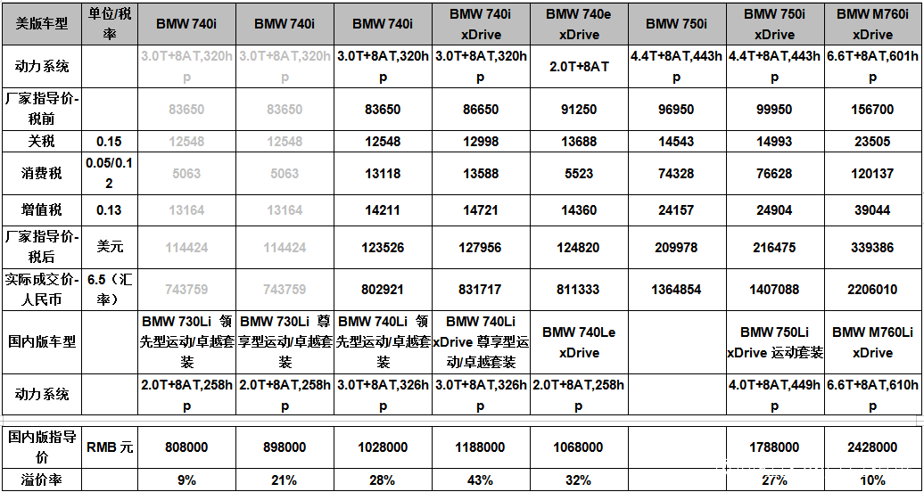 7系中美主要車型和價格見下表(表中灰色字體為對標車型價格):