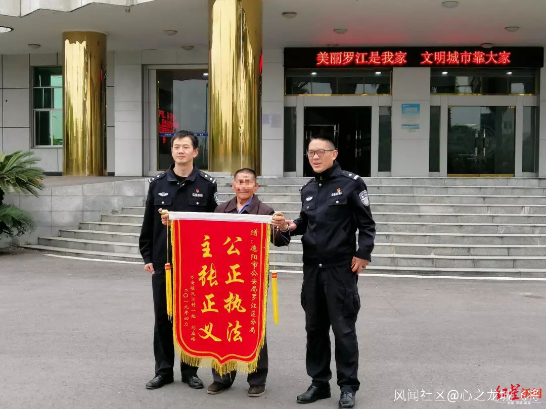 2019年4月18日,一名年逾70的劉老大爺,將一面“主張正義公正執法”的錦旗交到德陽羅江區公安分局刑偵民警手中,感謝民警幫助。