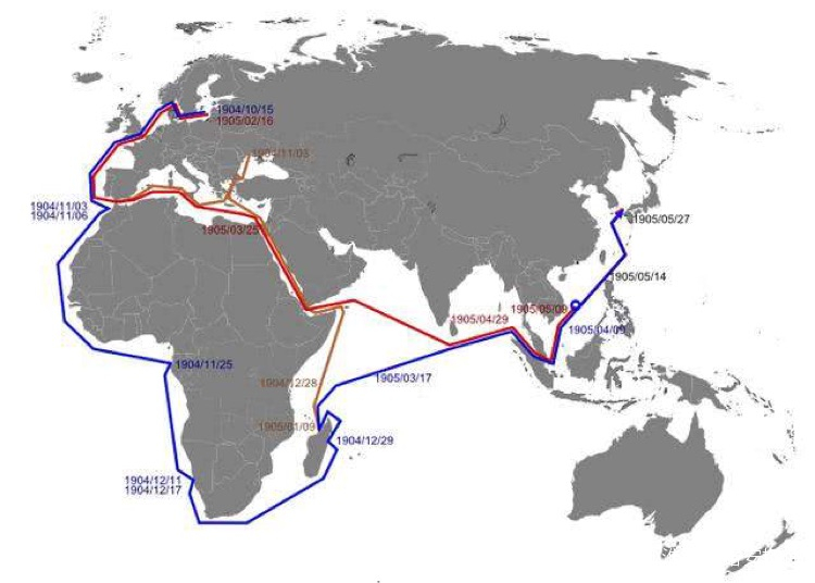 這支艦隊於1904年10月15日,從波羅的海的港口出發,途經北海、大西洋、印度洋等海域,行程18000海里,前往遠東作戰。雖然當時蘇伊士運河已經開通,但是這個運河掌握在日本的盟友英國手中,俄國艦隊是無法從這裏通行的。