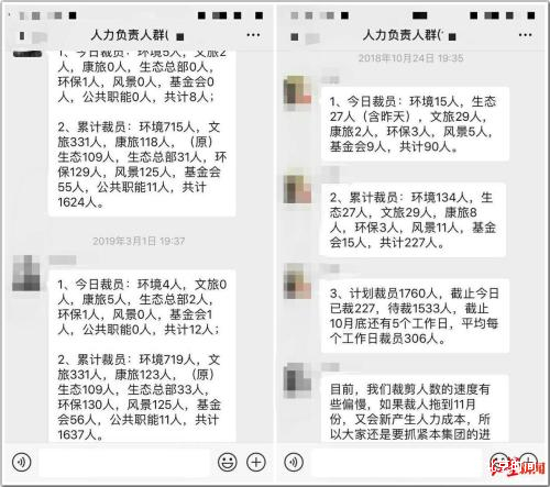 李女士説,這裏面肯定有主動離職的,主動離職的沒法統計,但是長期不發工資,那麼員工受不了,他就會提出離職。當然了,公司在去年11月底之前,還有一些裁員計劃,李女士提供的人力負責人微信羣截圖顯示,截至2019年3月1日,東方園林累計裁員1637人。