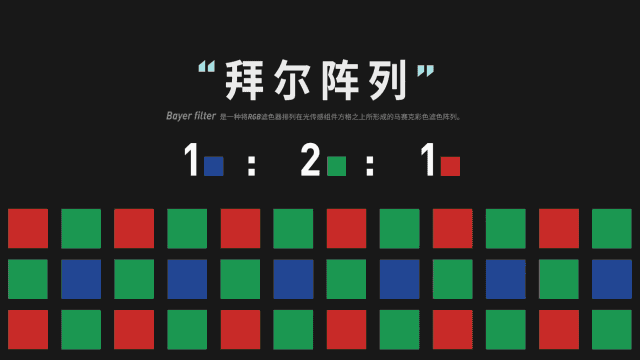 由於光電二極管無法識別顏色,所以不同像素上還要覆蓋紅綠藍三種濾色片,按 1:2:1 的比例設置,以模仿對綠光敏感的人眼,這稱為拜爾陣列,能分別識別三原色。