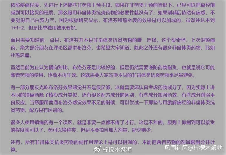 首先,我認為報告主要闡述了關於布洛芬等對於感染的負面作用,已有相關病症的患者需要提高警惕;其次,法藥署的用藥建議非常值得參考,我個人高度認同;第三,本報告屬於專業性國家級建議,但尚不能判斷其對於我國用藥環境的影響;第四、法藥署這次把撲熱息痛提到了枱面上,雙方都屬於非甾體抗炎藥,我認為在一定情況下有可替代性,在我之前寫的《硬核科普:布洛芬與暖水袋,關於緩解痛經的綜合性分析》一文中有過類似的觀點,我認為確實是可以考慮的。第五、具體用藥建議提前諮詢醫生或藥師。