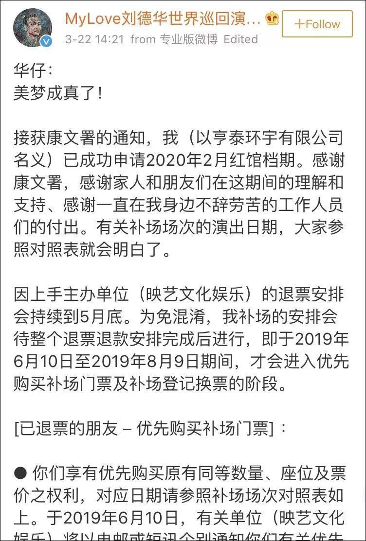 2019年3月22日,@MyLove劉德華世界巡迴演唱會 官方微博發文表示已成功申請到2020年2月的紅館檔期,將會重啓演唱會,並表示此前演唱會的退票安排會持續到5月底,補場會在退票結束後安排,已退票的朋友則擁有優先購買補場門票的權利。