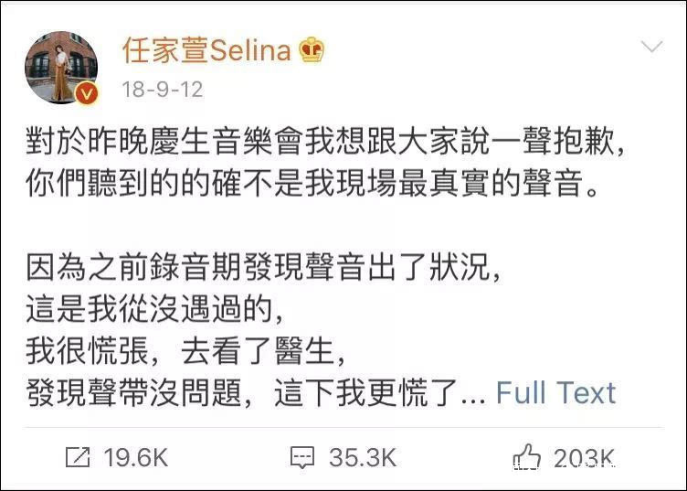 此前,女子演唱團體S.H.E的成員任家萱(Selina)因聲音狀況不適合演出,也在S.H.E成軍十七週年演唱會的直播裏的單人部分播放了錄音。事後@任家萱Selina 在第一時間發佈長文道歉,向觀眾解釋原因,因為不想因為個人原因取消9月11日的生日會,在跟製作部討論後,選擇“拉掉了現場的聲音”。