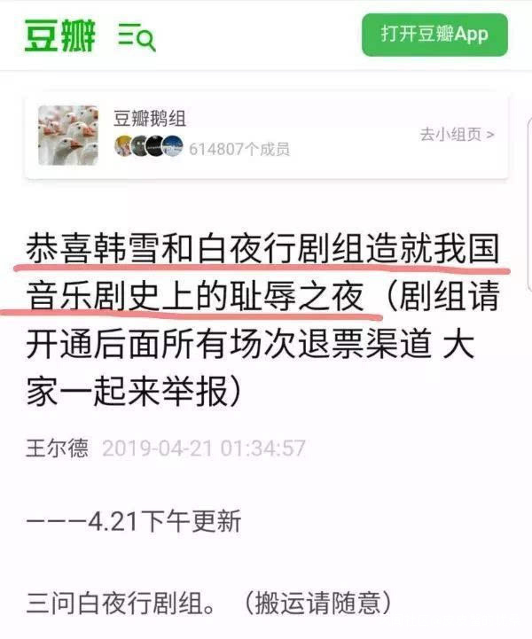 當晚,@韓雪 發微博感謝現場觀眾,稱這“是一場最特別的白夜行音樂劇”。此事一出,立刻引發爭議,網友認為這種做法“不顧行業道德”。4月21日,@白夜行音樂劇 在微博發佈致歉聲明。