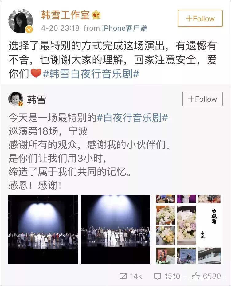 當晚,@韓雪 在微博中表示,“今天是一場最特別的《白夜行》音樂劇”,“感謝所有的觀眾,感謝我的小夥伴們。是你們讓我們用3小時,締造了屬於我們共同的記憶。”其工作室隨後轉發該微博並表示“選擇了最特別的方式完成這場演出,有遺憾有不捨”。