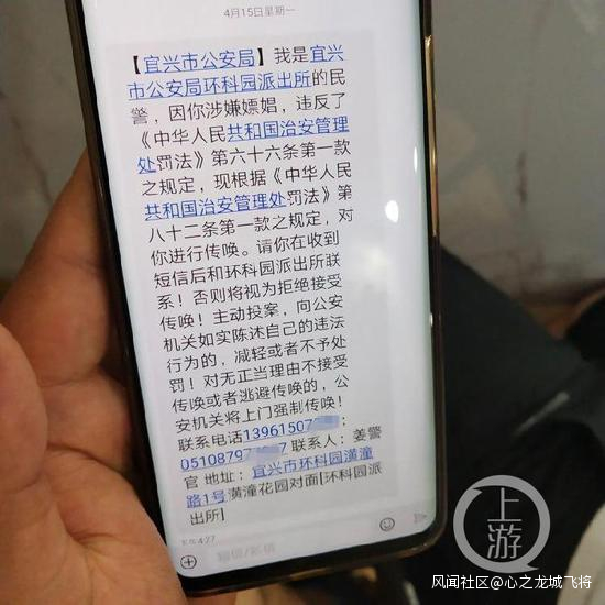 ▲熱傳圖片顯示,警方以涉嫌嫖娼為由,通知消費額超過600元人員到警方配合調查。圖片來自網絡 上游新聞記者注意到,兩張熱傳圖片中,一張是發自4月15日的短信消息,發送者自稱是宜興市公安局環科園派出所民警。短信內容顯示,“因你(即收件人)涉嫌嫖娼,違反了《中華人民共和國治安管理處罰法》第六十六條第一款之規定,現依據《中華人民共和國治安管理處罰法》第八十二條第一款之規定,對你進行傳喚。”